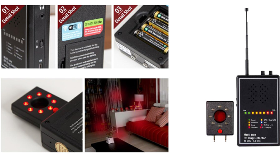 디지털 주파수 및 렌즈 탐기로 유·무선 카메라 렌즈 탐지는 물론 무선 및 IP 카메라, 무선 도청기, 휴대폰(LTE, 2G, 3G, 4G), WIFI 까지 다양한 형태의 불법촬영 및 도청 장치를 하나의 장비로 탐색 할 수 있습니다. 수영장, 탈의실, 찜질방, 공중화장실등의 불법촬영이 의심되는 장소 및 회사, 사무실, 회의실, 기업내 도청, 불법촬영을 통한 산업스파이 정보 노출 방지용에 적합하며, 50MHz ∼ 6GHz 대의 폭넓은 대역을 탐지하는 소형 전문가용 탐지 장비입니다.